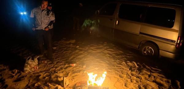 8月7日0时40分,另外2名游客被找到,所有人员集中至车辆停放区域,齐心协力将商务车拖拽出沙地。