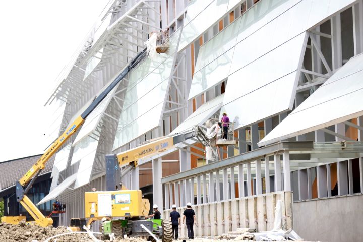 设备轰鸣,人员集结,挂图作战。走进桐乡乌镇世界互联网科技馆项目建设现场,切割声、电钻音、机械鸣,此起彼伏,项目建设正进入关键的冲刺期。