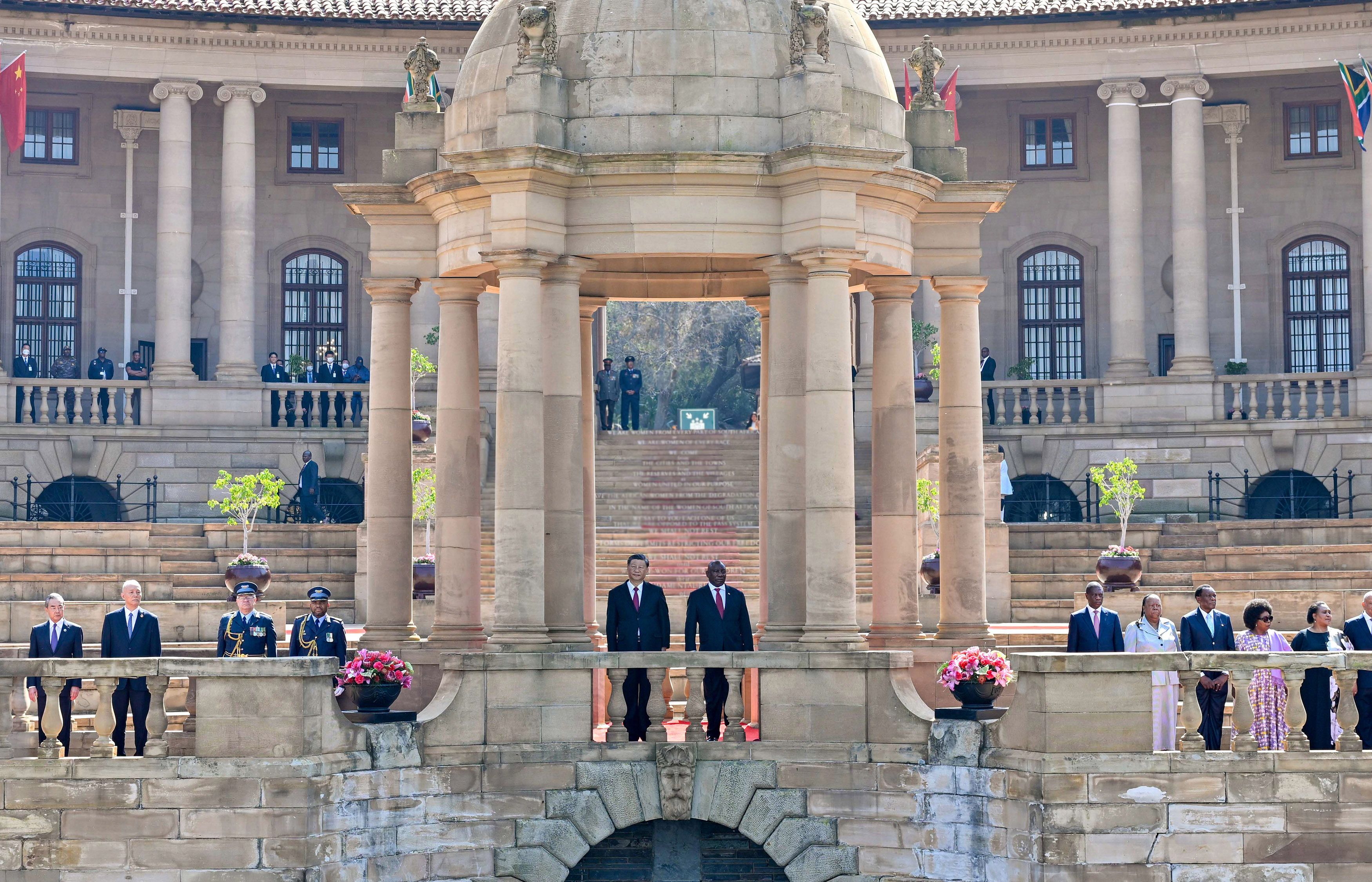 8月的比勒陀利亚,晴空万里,惠风和畅。总统府广场鲜花盛开,中南两国国旗迎风飘扬。在总统摩托车队护卫下,习近平乘车抵达总统府,拉马福萨在下车处热情迎接。两国元首登上检阅台。仪仗队行持枪礼,军乐队奏中南两国国歌,现场鸣放21响礼炮。习近平检阅南非仪仗队。两国元首同双方陪同人员一一握手。