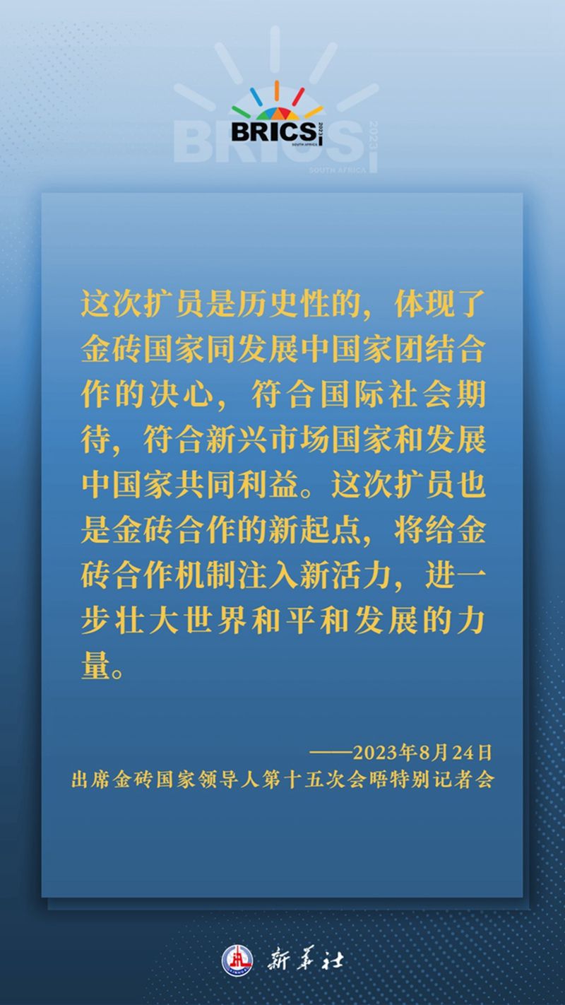 8月22日至24日,金砖国家领导人第十五次会晤在南非约翰内斯堡举行,习近平主席出席。在会晤中,习近平主席同其他金砖国家领导人一致同意,邀请沙特、埃及、阿联酋、阿根廷、伊朗、埃塞俄比亚成为金砖大家庭成员。