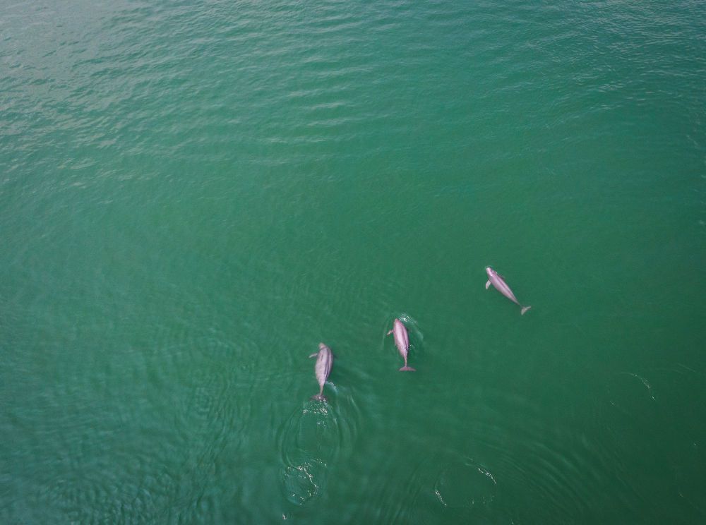 这是2021年5月11日在湖北省宜昌市拍摄的在水中嬉戏的长江江豚(无人机照片)。新华社记者 肖艺九 摄