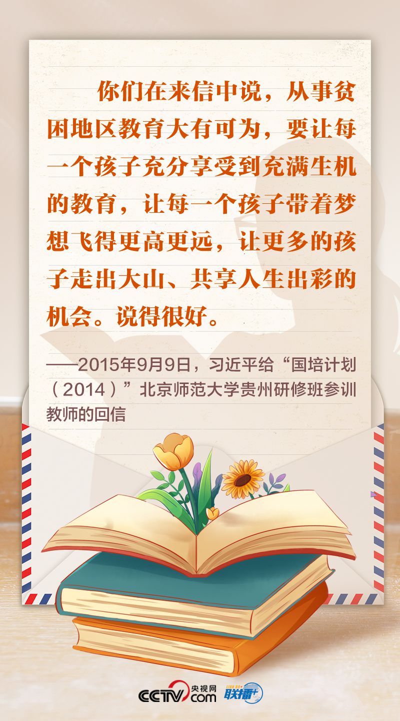 一年后,当时参加座谈的教师给总书记写信,汇报了一年来的工作、学习、思想情况。在回信中,总书记叮嘱他们,为推动贫困地区教育事业的加快发展,要“努力做教育改革的奋进者、教育扶贫的先行者、学生成长的引导者”。