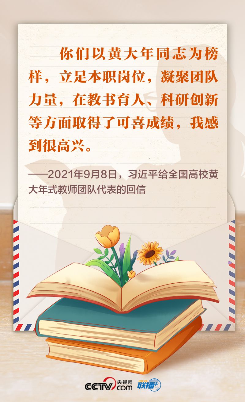 2021年,首批黄大年式教师团队的代表给总书记写信,汇报教学、科研等工作情况,表达了坚守教育报国理想、为民族复兴贡献力量的决心。总书记回信肯定了大家的工作成效,勉励大家继续学习弘扬黄大年同志等优秀教师的高尚精神,立德修身,潜心治学,开拓创新,真正把为学、为事、为人统一起来,当好学生成长的引路人。