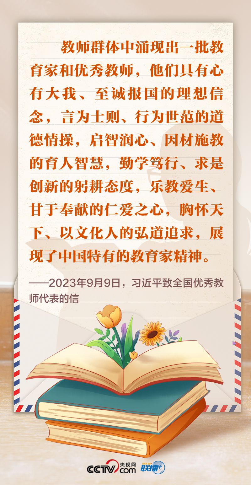 2023年9月9日,全国优秀教师代表座谈会在北京召开。刚结束黑龙江之行的习近平总书记致信与会教师代表,充分肯定广大教师为国家发展、民族振兴作出的重要贡献,深刻阐释教育家精神的丰富内涵和实践要求,希望大家以教育家为榜样,大力弘扬教育家精神,为强国建设、民族复兴伟业作出新的更大贡献。