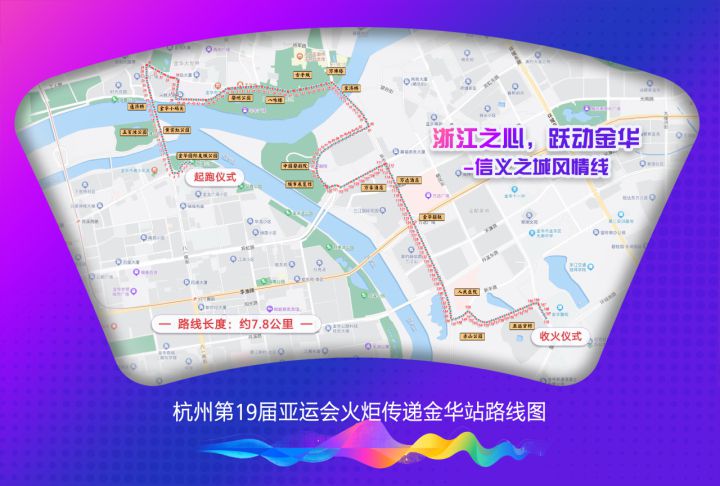 杭州第19届亚运会火炬传递金华站活动将于9月17日上午9时,在金华国际友城公园广场正式启动。本次火炬传递以“浙江之心·跃动金华”为主题,传递路线从国际友城公园出发,途径通济桥、人民广场、小码头、婺州公园、古子城、宏济桥、中国婺剧院、浙中总部经济中心、赤山公园等,最后到达金华亚运分村,总长度约7.8公里。