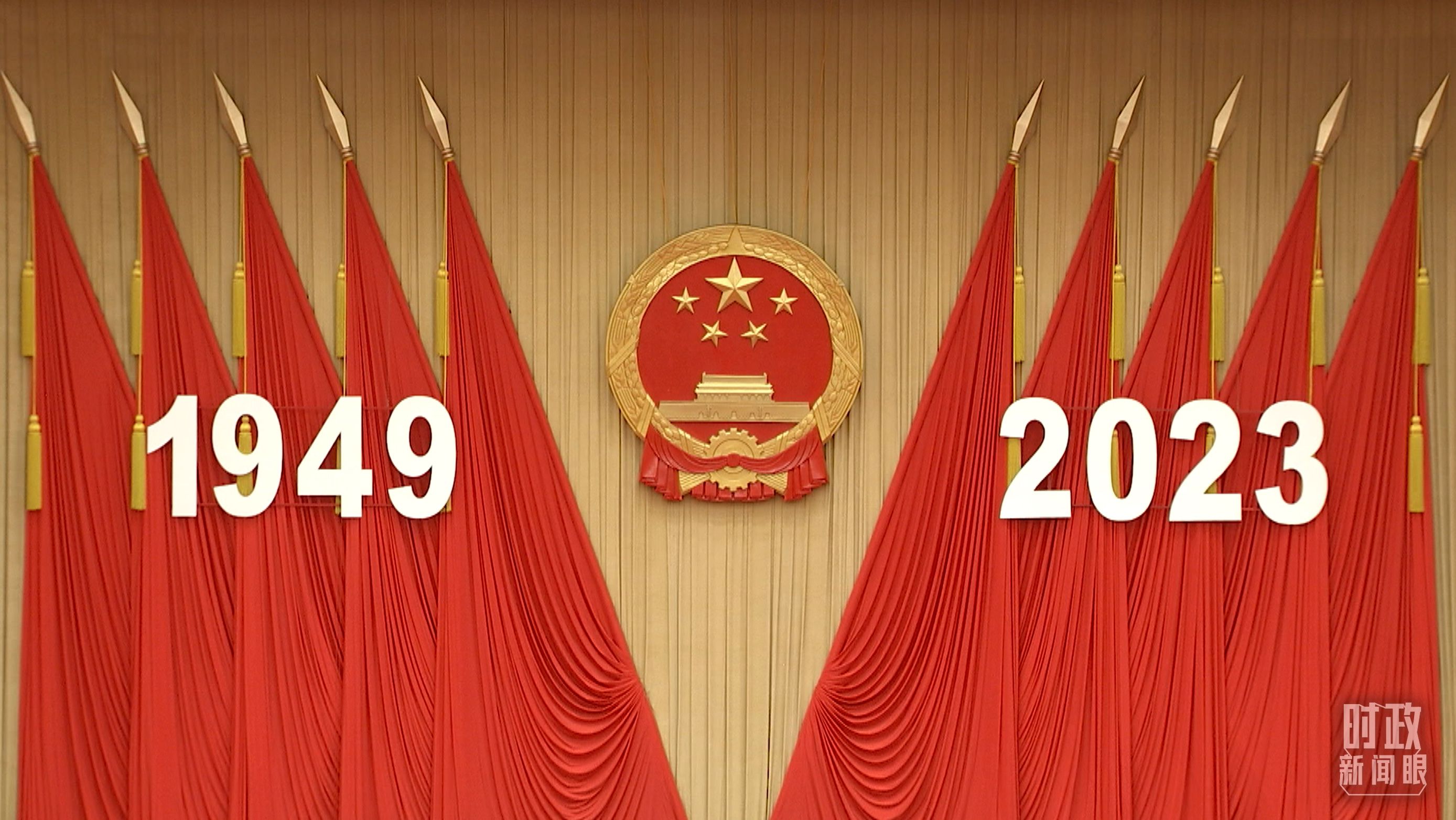 △人民大会堂宴会厅内,主席台上方高悬着庄严的国徽,“1949-2023”大字年号在鲜艳的红旗映衬下格外醒目。