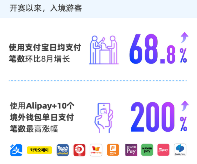 支付宝商家服务平台显示,支付宝商家收钱码领取量在亚运期间较日常上涨近10倍。开幕以来,入境游客使用支付宝日均支付笔数环比8月增长68.8%。此外,使用mPay、Hipay、Changi Pay、Naver Pay等10个Alipay+境外钱包在境内单日交易笔数最高增幅200%。西湖商圈、武林商圈、河坊街则是外国游客在杭州观赛之余最喜爱的三大热门消费地。