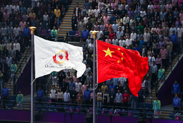 中华人民共和国国旗、亚奥理事会会旗在会场飘扬。图源:杭州第19届亚运会组委会