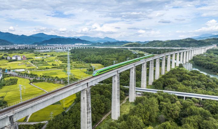 列车行驶在金台铁路仙居永安溪大桥上(无人机照片)陈月明 摄