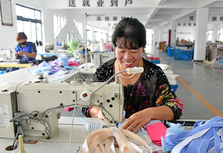 在仙居县田市镇水阁村“共富工坊”,工人忙着赶制服装 王华斌 摄