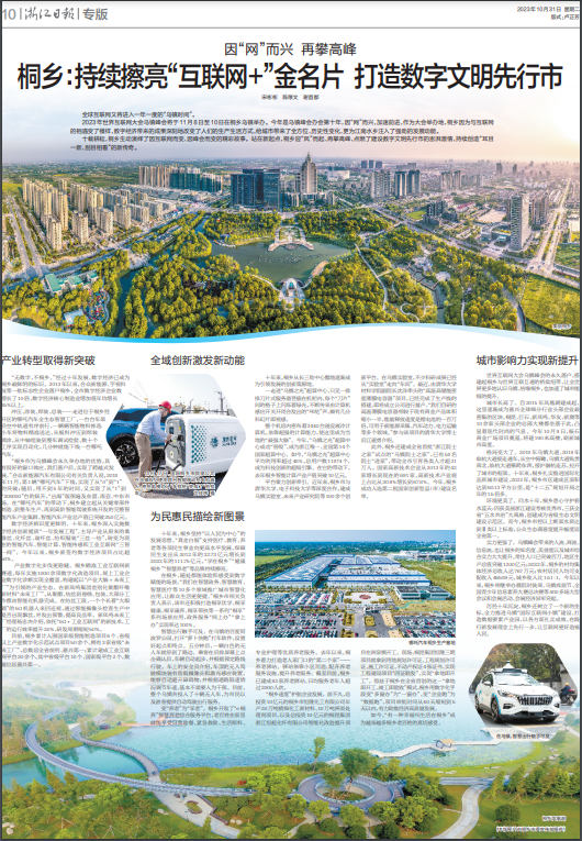 10月31日,《浙江日报》刊发《因“网”而兴 再攀高峰 桐乡:持续擦亮“互联网+”金名片 打造数字文明先行市》,全文如下: