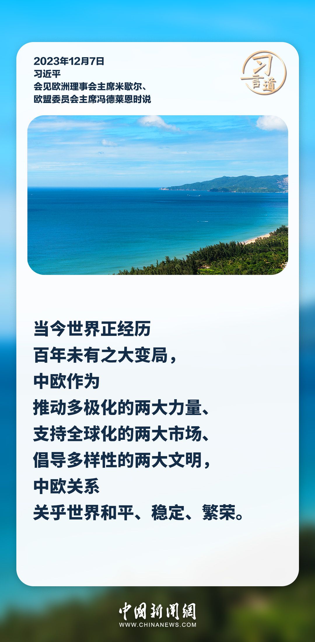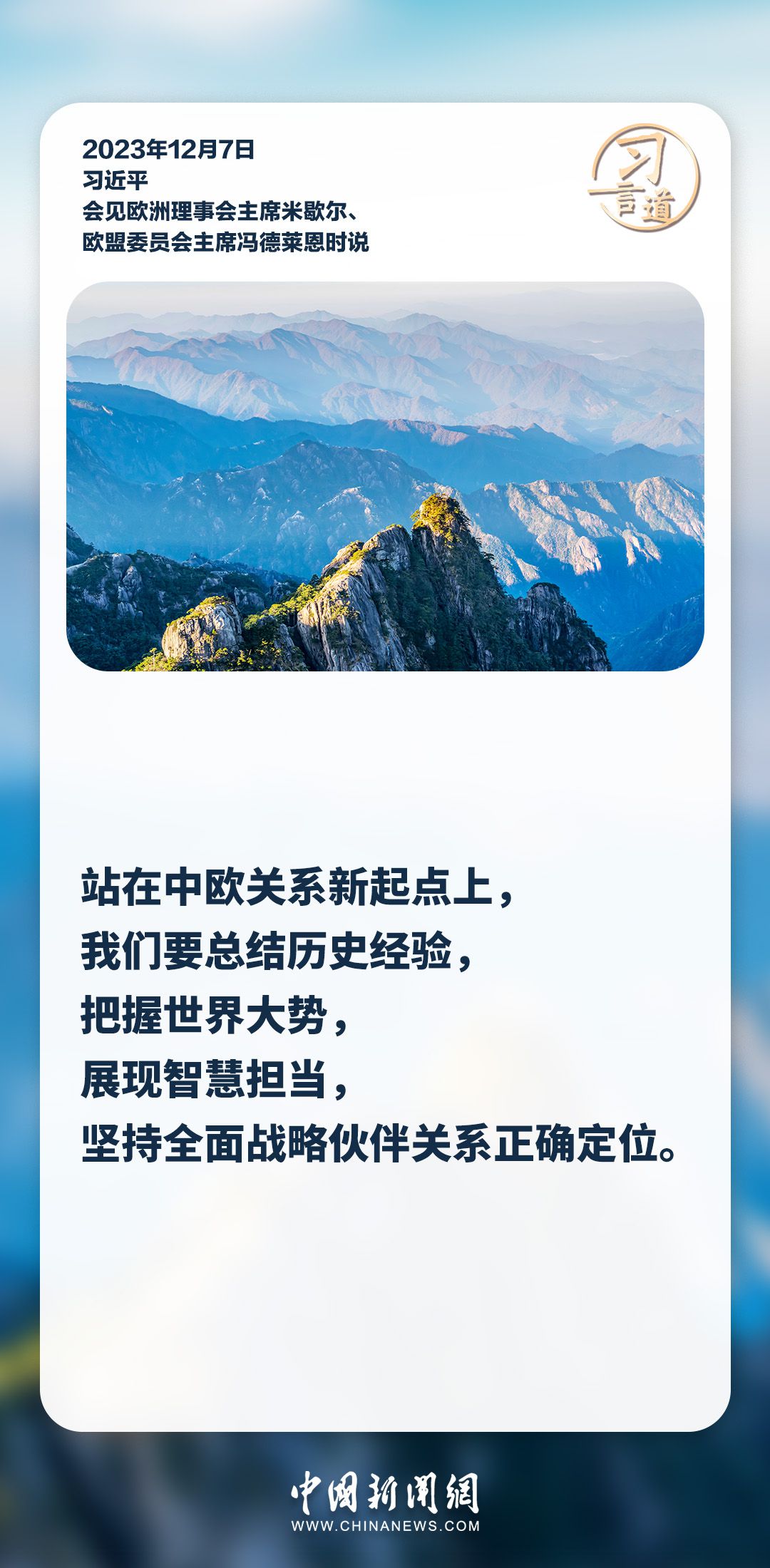 12月7日,国家主席习近平在钓鱼台国宾馆会见来华举行第二十四次中国—欧盟领导人会晤的欧洲理事会主席米歇尔和欧盟委员会主席冯德莱恩。习近平说——