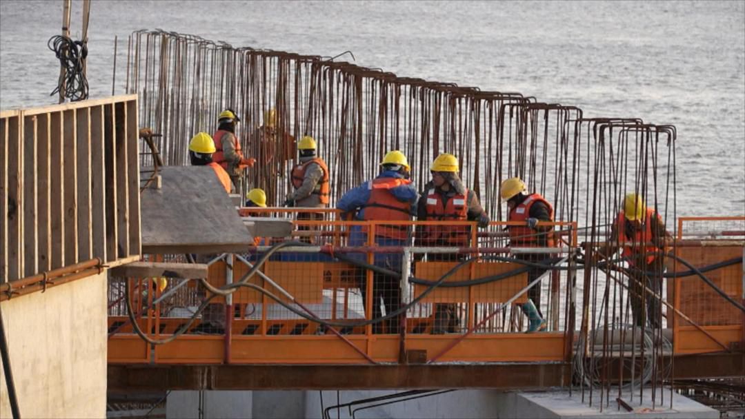 在还未完全成型的码头平台上,七八十位工人有扎钢筋的,有做桥墩维护。当施工的场景架设在波涛汹涌的海面上,刺骨的寒风在耳边呼啸,再简单的操作都变得不那么容易。