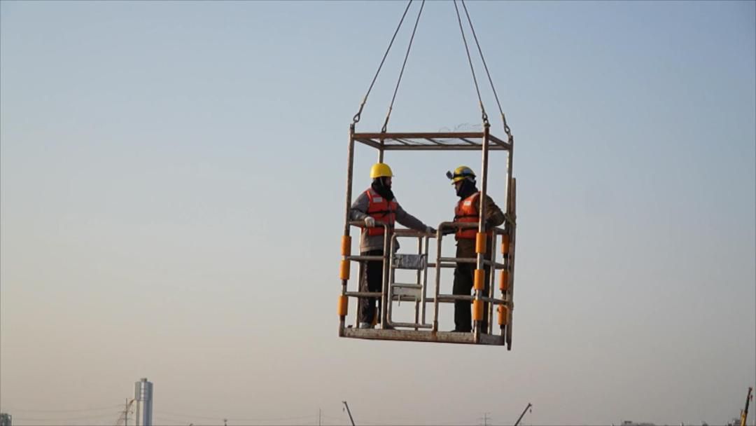 置身于毫无遮挡的引桥,刺骨的冷风不仅为工人们带来了体感上的寒冷,也让他们手中的钢筋水泥都愈显冰凉。工人们每天都要坐上一个镂空的吊笼,从码头转移到停泊在海上的货轮上,然后进行材料码放,吊钩安装等作业。