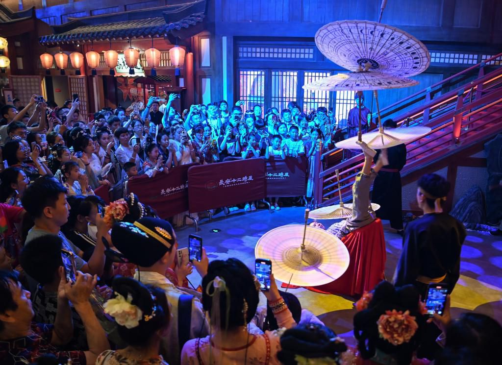 游客在长安十二时辰主题街区观看唐风演艺《长安百艺》。新华社记者邹竞一 摄