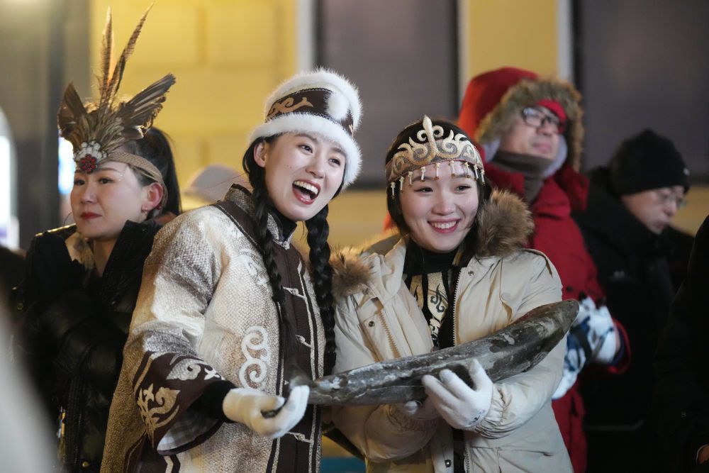 ↑1月6日,戴着鱼皮头饰的赫哲族姑娘(右)与饶河县文旅推荐官在哈尔滨中央大街上推介家乡特产鱼品。