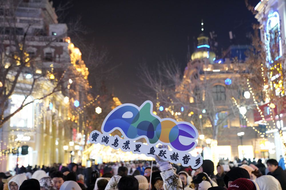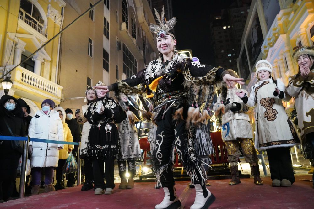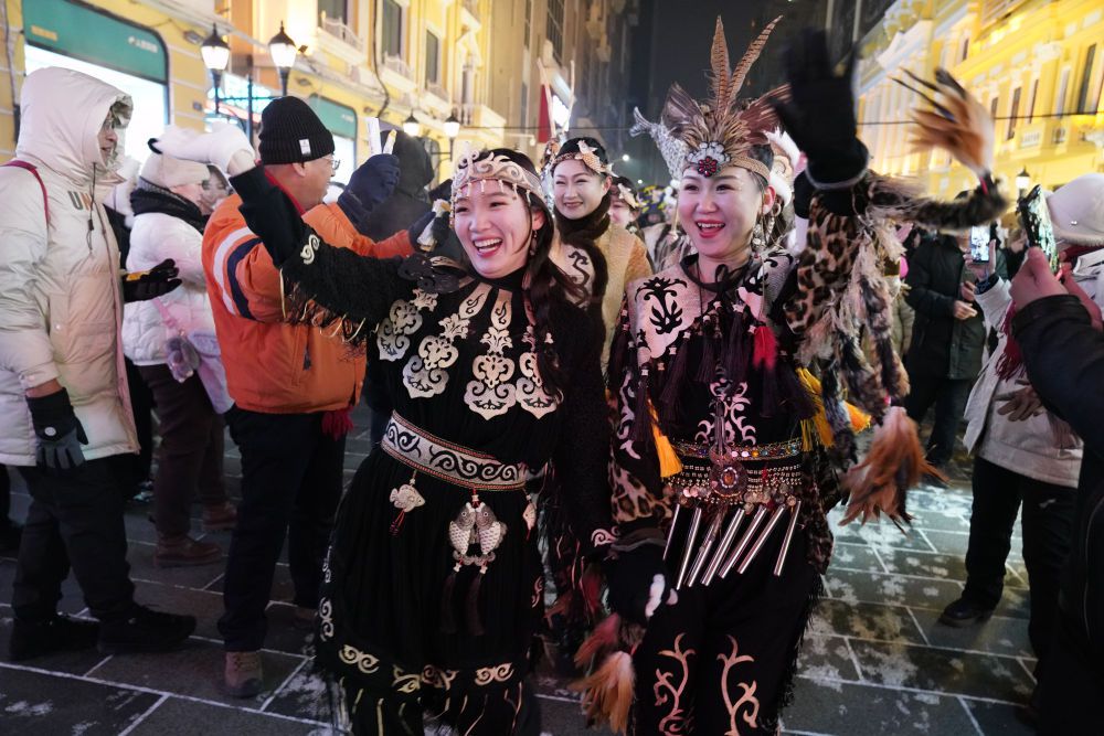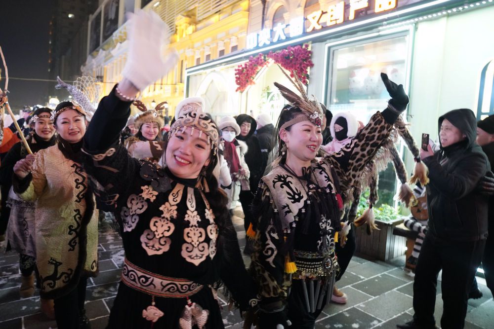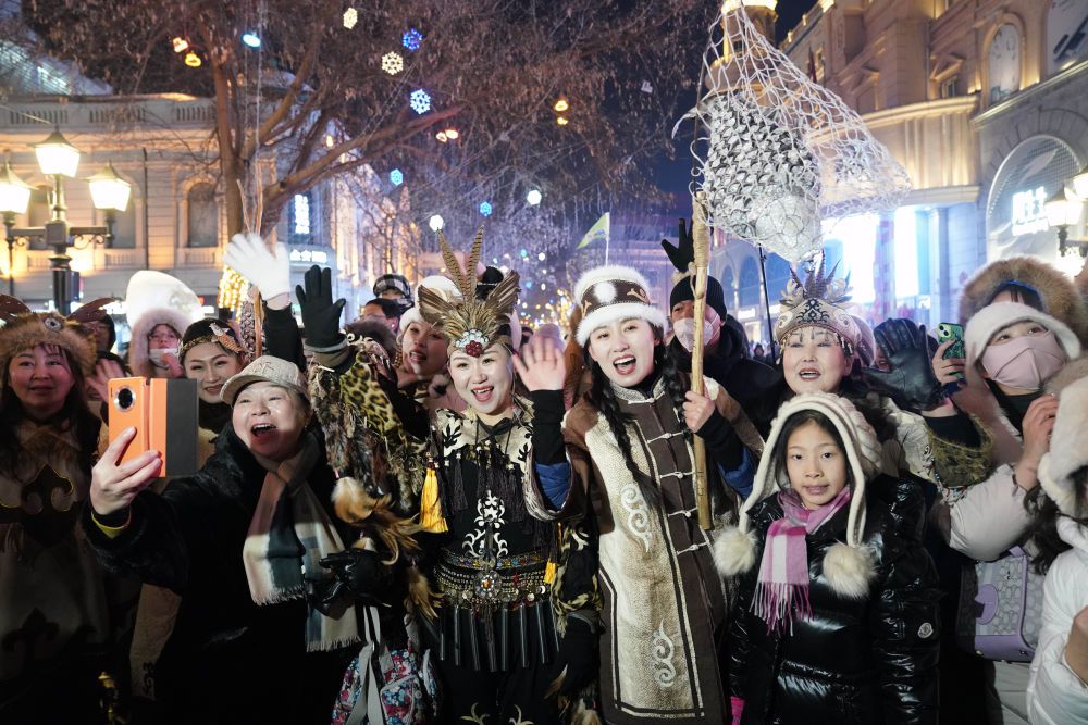 ↑1月6日,身着赫哲族服饰的赫哲族群众和饶河县文旅推荐官在哈尔滨中央大街上与游客互动。