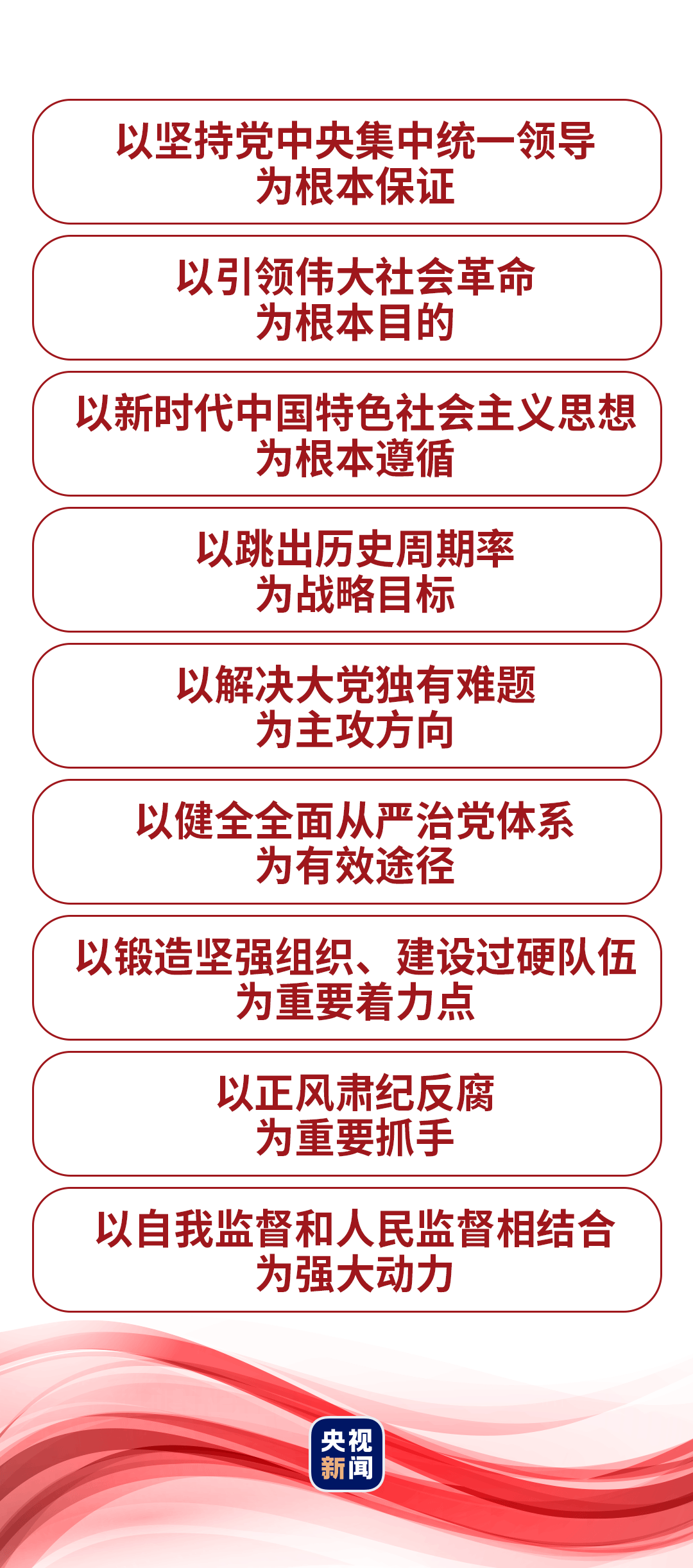 “党的十八大以来,在推进全面从严治党的伟大实践中,我们不断进行实践探索和理论思考,在毛泽东同志当年给出‘让人民来监督政府’的第一个答案基础上,给出了第二个答案,那就是不断推进党的自我革命。”2024年1月8日,在二十届中央纪委三次全会上,习近平总书记发表重要讲话,深刻阐述党的自我革命的重要思想,明确提出“九个以”的实践要求,为新时代新征程深入推进全面从严治党、党风廉政建设和反腐败斗争提供根本遵循。
