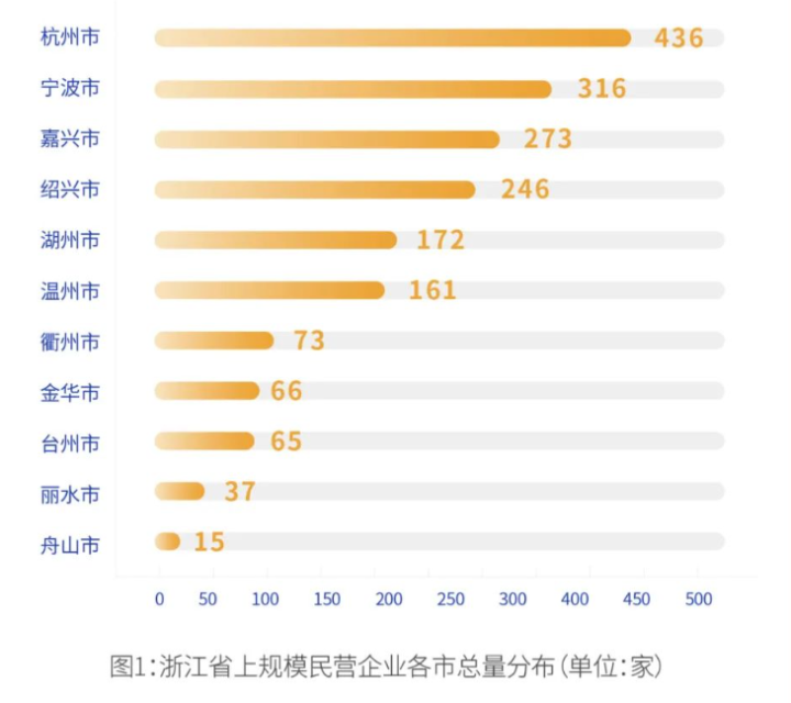 从市域分布看,注册地在杭州的上规模民企436家,宁波316家,嘉兴273家,分别位居城市前三位。从县域分布看,绍兴柯桥区、杭州萧山区、杭州拱墅区三个区分别以81家、70家和69 家位居前三。有10个县(市、区)的上规模民企数量超过了50家,9个县(市、区)数量超过40家,7个县(市、区)数量超过30家。