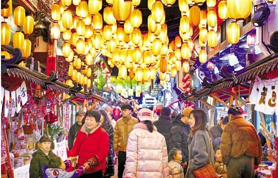 近日,市民和游客徜徉在武义县张灯结彩的古城老街。 拍友 张建成 李云升 摄