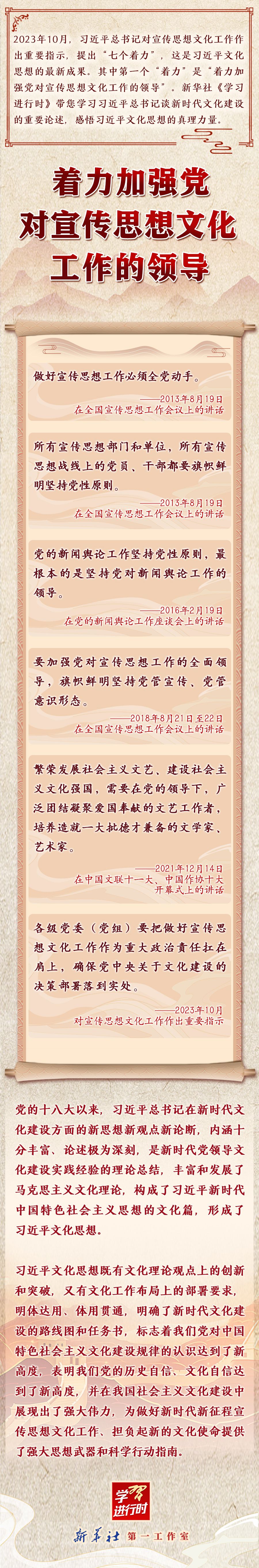 学习进行时丨领悟习近平文化思想系列之一:着力加强党对宣传思想文化工作的领导