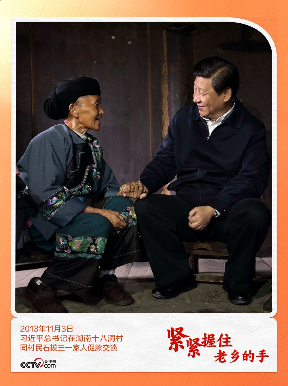 同一天,总书记在村民施成富家门前的空地上开了一场座谈会,“同大家一起商量脱贫致富奔小康之策”。座谈时,一群人围坐一圈,总书记微笑着拉住施成富的手,施成富笑容灿烂。