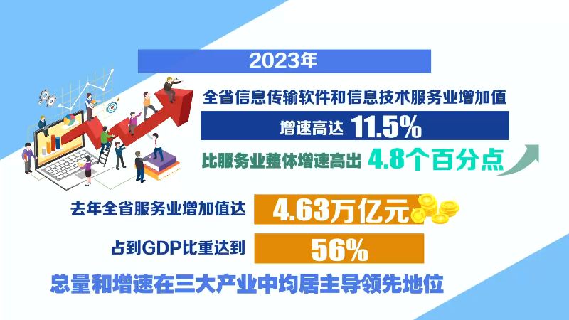 新企业不断涌现、传统企业加速转型,这让我省现代服务业增势强劲。去年,全省信息传输软件和信息技术服务业增加值增速高达11.5%,比服务业整体增速高出4.8个百分点。在此带动下,去年全省服务业增加值达4.63万亿元,占到GDP比重达到56%。总量和增速在三大产业中均居主导领先地位。