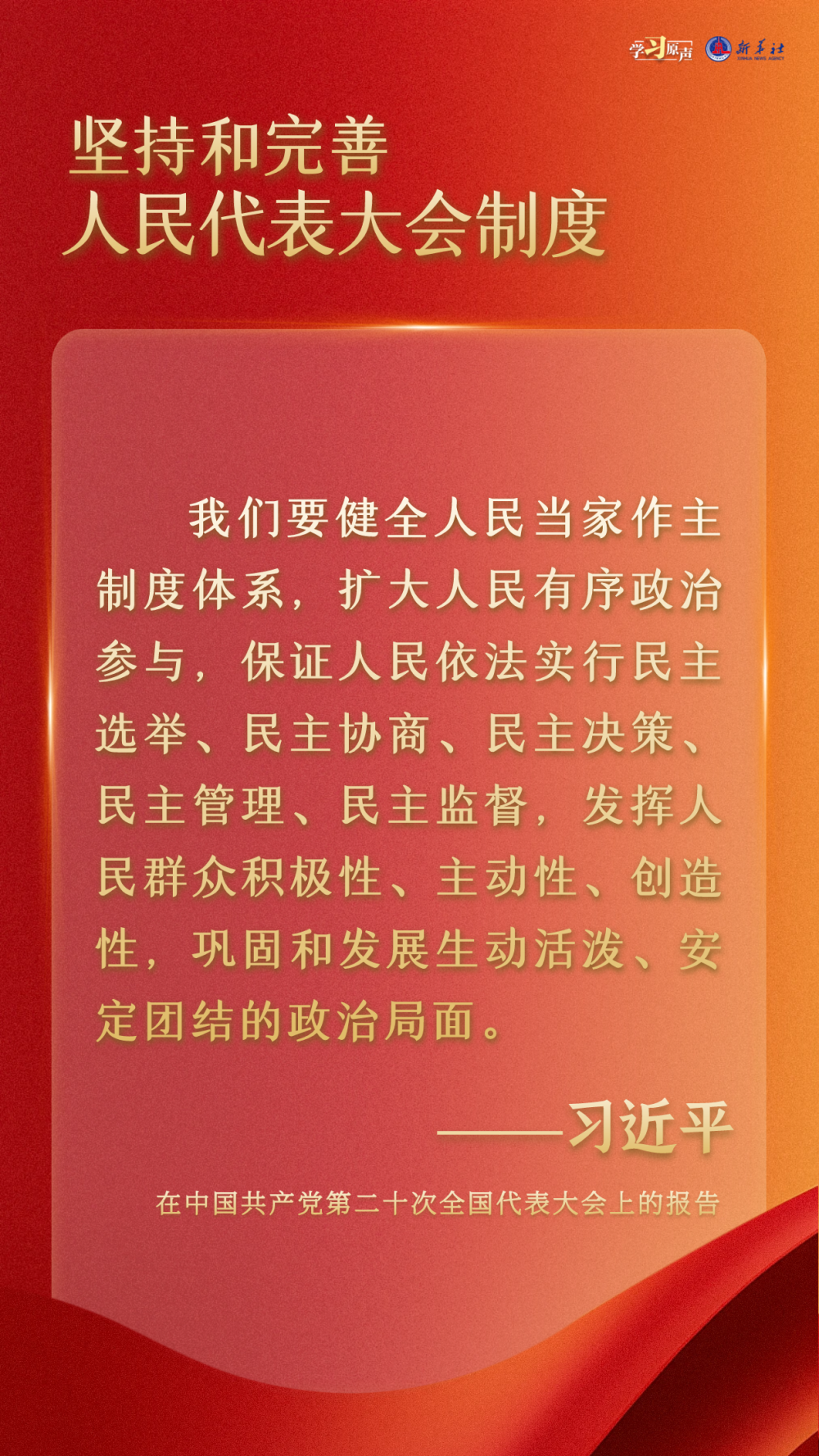 今年是全国人民代表大会成立70周年。新的历史起点上,在以习近平同志为核心的党中央坚强领导下,我们要坚持中国特色社会主义政治发展道路,坚持和完善人民代表大会制度,加强和改进新时代人大工作,不断发展全过程人民民主,巩固和发展生动活泼、安定团结的政治局面。