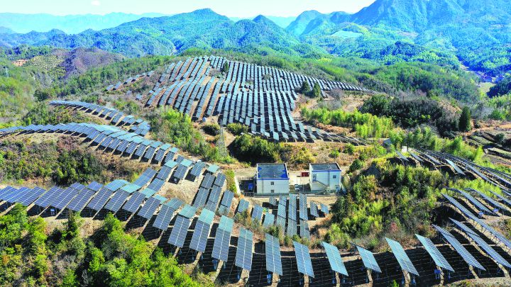 在仙居县上张乡,一排排光伏板在阳光下源源不断输送绿色清洁能源。近年来,仙居县上张乡流转荒山、荒坡发展光伏产业,让荒山变成“金山银山”。拍友 王华斌 摄