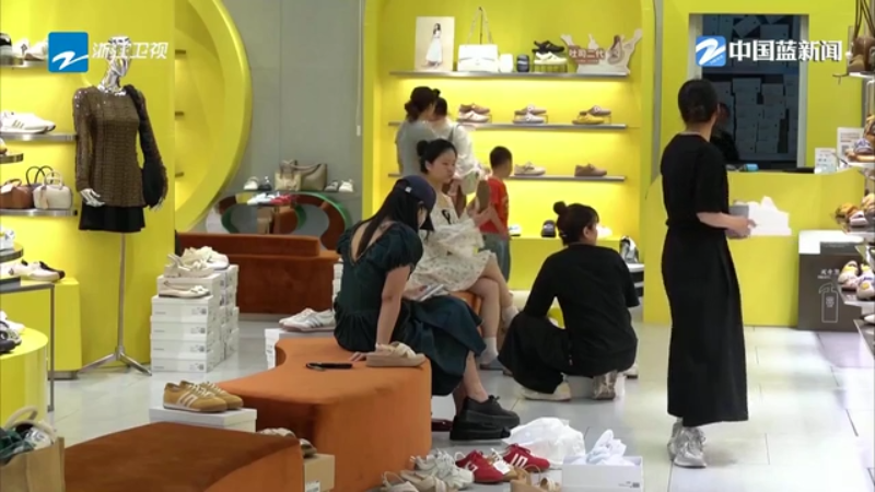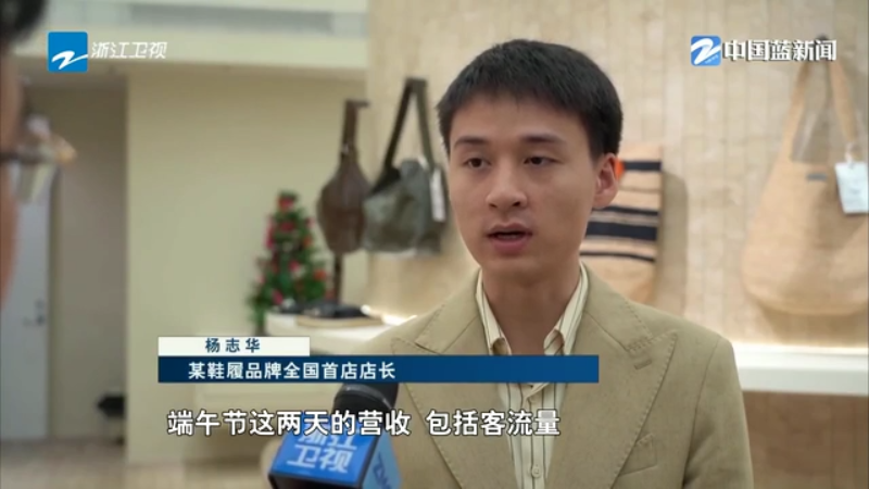 某鞋履品牌全国首店店长 杨志华:端午节这两天的营收,包括客流量话都是超出我们预期,营收这一块的话是比预计的高30%,客流的话是比预期的高出50%。