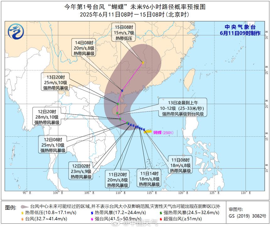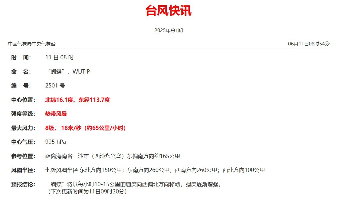 据中央气象台最新消息,今天(11日)8时,今年第1号台风“蝴蝶”(WUTIP)在距离海南省三沙市(西沙永兴岛)东偏南方向约165公里海面上生成,中心位置北纬16.1度、东经113.7度,强度等级为热带风暴,中心附近最大风力8级(18米/秒),中心最低气压995 hPa。预计“蝴蝶”将以每小时10-15公里的速度向西偏北方向移动,强度逐渐增强。