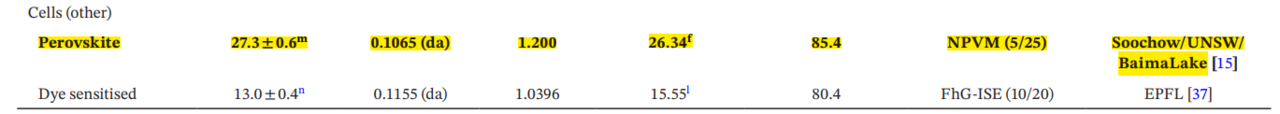 此外,在《太阳能电池效率表》上,还有隆基绿能、天合光能、仁烁光能、极电光能等其他中国企业。其中,浙江企业纤纳光电的钙钛矿小组件全面积稳态效率达到23.9%,这是该企业自2017年以来第13次登榜。