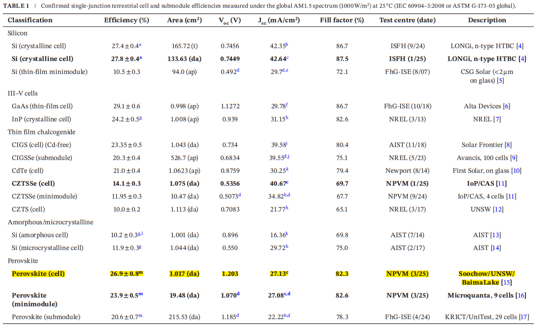 据介绍,《太阳能电池效率表》由“太阳能之父”马丁·格林教授主持编制,自1993年1月起,每六个月发布一次,刊登在国际权威杂志《Progress in Photovoltaics(光伏的进展)》上。