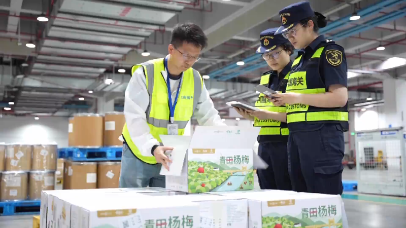 丽水海关查检四科科长朱伟豪说:“整个通关过程中是实现一个无缝链接、零耽搁,能让新鲜杨梅以最新鲜的状态到达国外的消费者手上。”