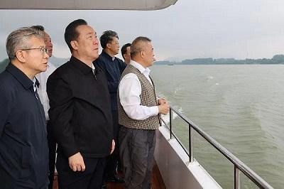 6月11日,王浩在富阳区乘船沿途考察钱塘江流域综合治理保护工作。潮新闻记者 李震宇 摄