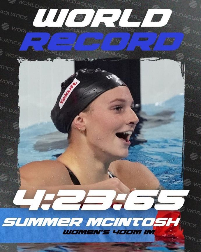 当地时间11日,加拿大游泳选拔赛女子400米混合泳项目中,18岁的天才少女萨默·麦金托什以4分23秒65的成绩打破了由她自己在去年奥运选拨赛创造的4分24秒38的世界纪录。这也是她在本届比赛继400米自由泳和200米个人混合泳之后,五天内打破的第三项世界纪录。