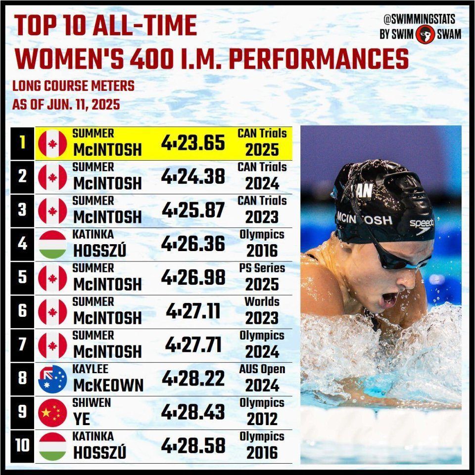 女子400米混合泳历史最快成绩,前三位全部由麦金托什创造。
