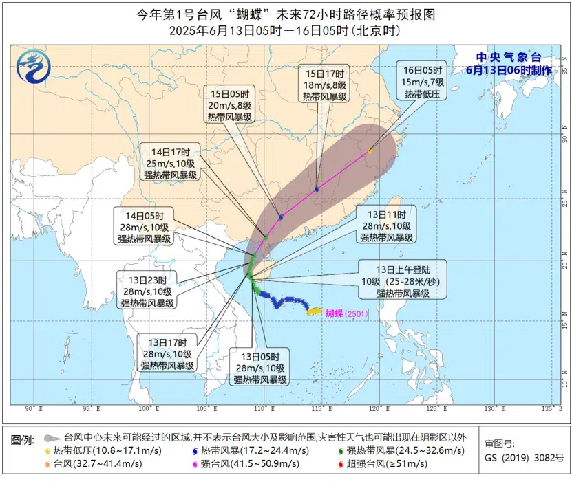 今年第1号台风“蝴蝶”(热带风暴级)已于昨天(12日)晚上加强为强热带风暴级,今天(13日)早晨5点钟其中心位于海南省乐东县南偏东方向大约35公里的近海海面上,就是北纬18.1度、东经109.0度,中心附近最大风力有10级(28米/秒),中心最低气压为982百帕,七级风圈半径100-260公里,十级风圈半径60-80公里。