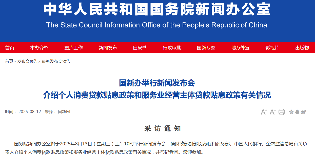 据国新网发布,国务院新闻办公室将于2025年8月13日(星期三)上午10时举行新闻发布会,请财政部副部长廖岷和商务部、中国人民银行、金融监管总局有关负责人介绍个人消费贷款贴息政策和服务业经营主体贷款贴息政策有关情况,并答记者问。