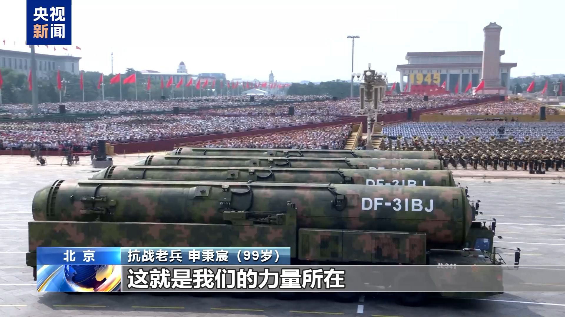 抗战老兵 申秉宸:我们新中国的胜利,首先是由我们这些先烈们,以自我牺牲精神争取过来的,他们是我们国家的脊梁。要铭记历史,要反对战争,要争取和平,热爱和平。光热爱不行,不能依靠妥协、祈求和平,需要有保卫和平的力量。我们国家的实力增强了,我们军队的现代化水平提高了,我们人民群众的爱国主义思想也发展提高了。这就是我们的力量所在,就是保卫和平的力量。