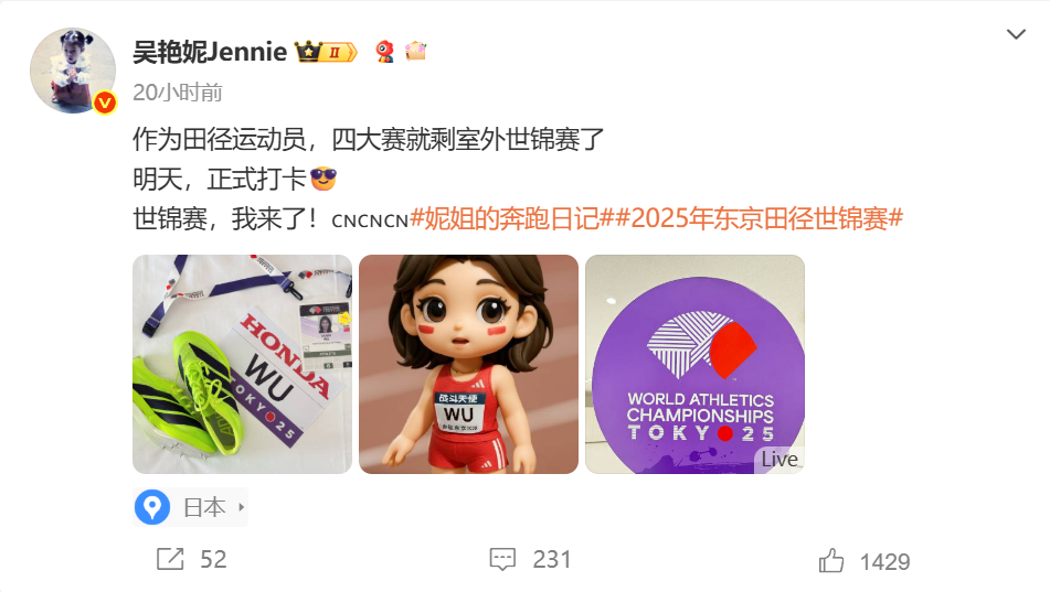 虽然早在2016年就参加过U20世青赛,但世锦赛吴艳妮还是首次参加。在昨天,吴艳妮在社交媒体上发文,表示自己作为田径运动员,四大赛就剩室外世锦赛了。今天,她也完成了自己在室外世锦赛的首秀。