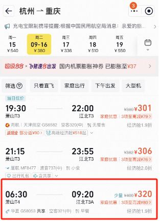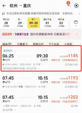 记者查询在线旅行平台发现,以杭州到重庆航线为例,9月30日从杭州出发到重庆,早上6点半(当日最低价)出发的航班经济舱价格都超过1100元。而同样的航班9月16日的价格只有300多元。