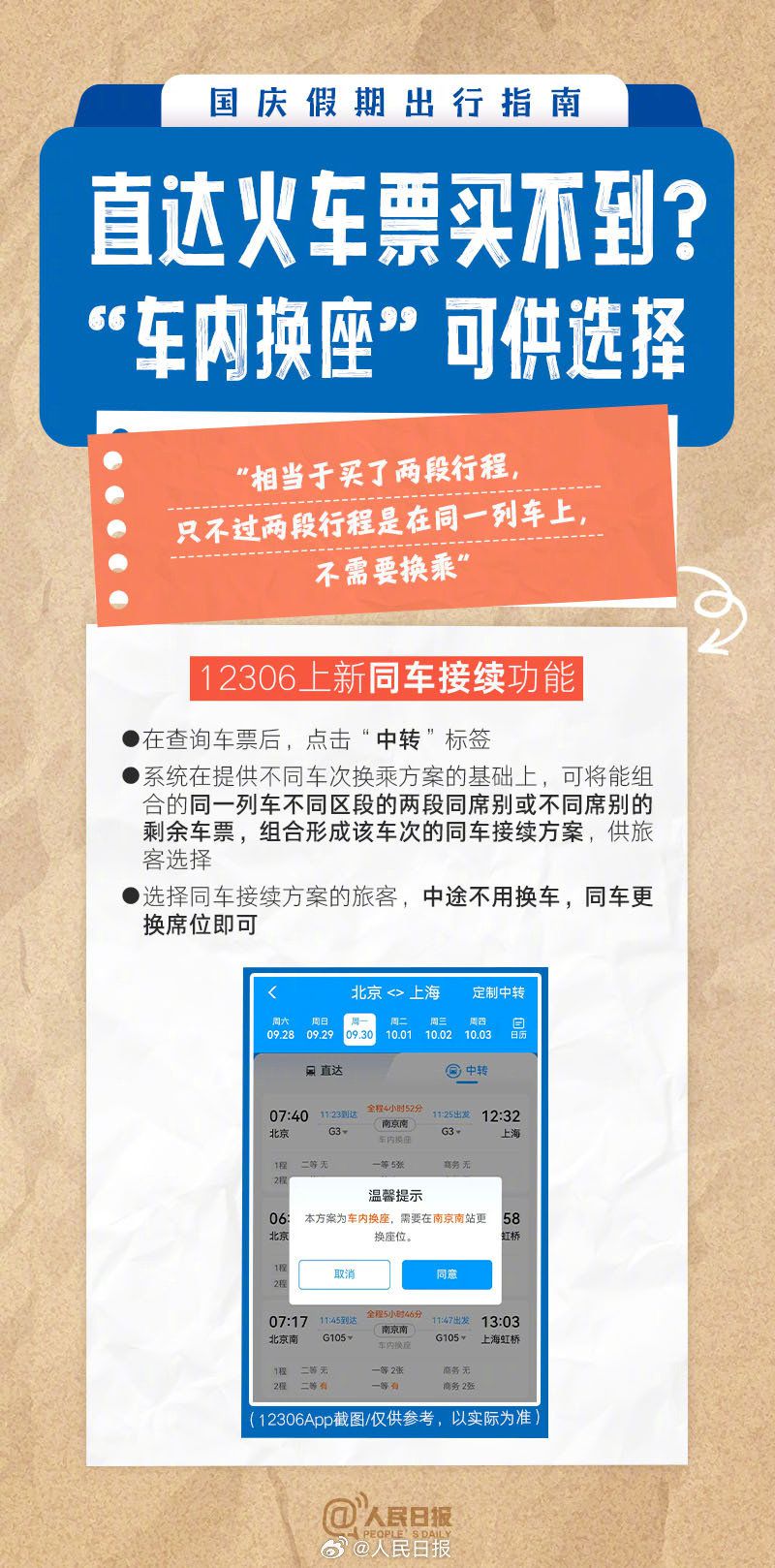 假期运输期间,全国铁路将实行高峰运行图,日均计划开行旅客列车约1.3万列。9月29日至10月2日、10月7日至10月9日高峰时段将安排开行夜间高铁。铁路12306将兼顾长短途需求,及时向客流集中的车站投放票额,用好候补购票、在线选铺、起售提醒等功能,最大限度满足旅客出行需求。