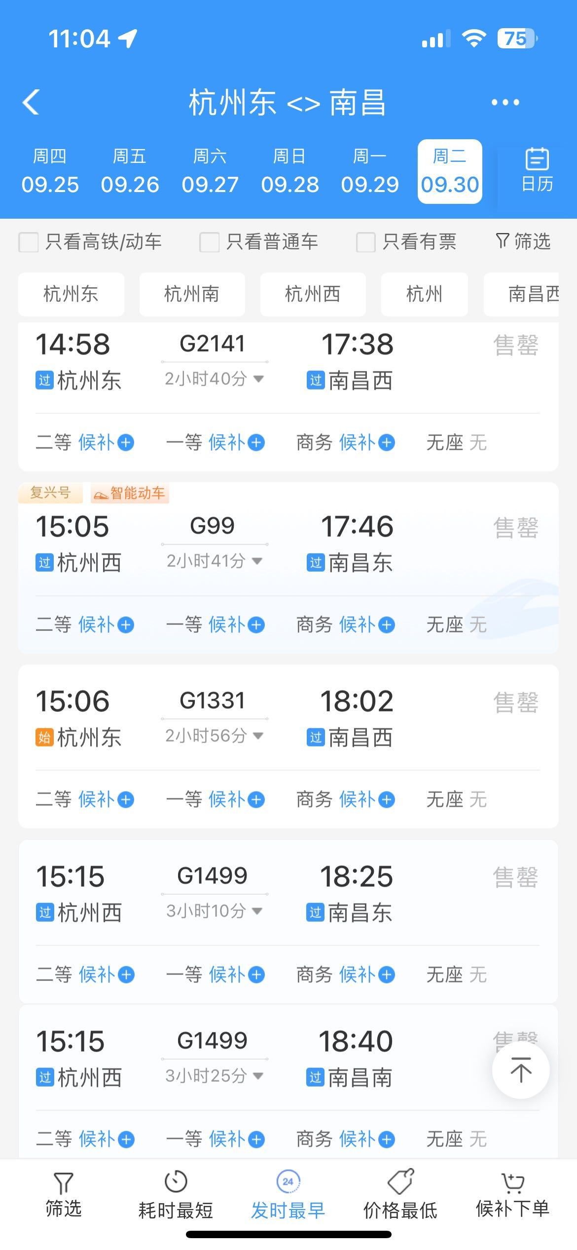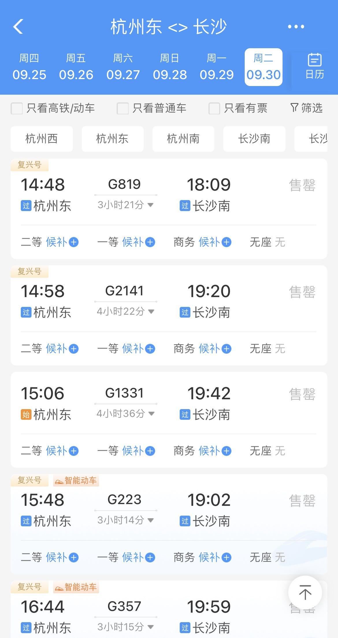 此外,9月30日杭州出发前往上海、南京等短途热门目的地的高铁,中午以后的车票也是大面积售罄。