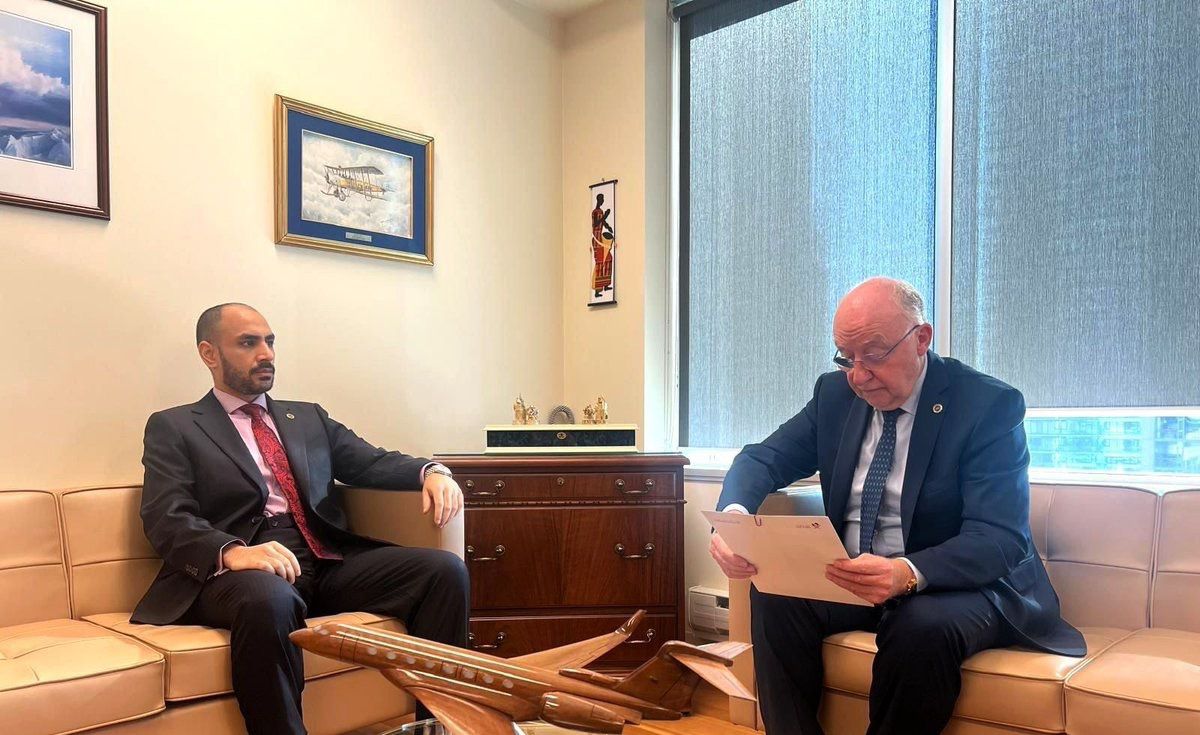 卡塔尔常驻国际民用航空组织代表阿卜杜拉·马尔基(左)20日向国际民航组织理事会主席夏基塔诺递交信函