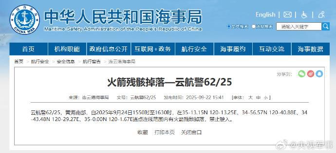 据中国海事局网站消息,连云港海事局发布航行警告,9月24日15时50分至16时30分,黄海南部有火箭残骸掉落,禁止驶入。
