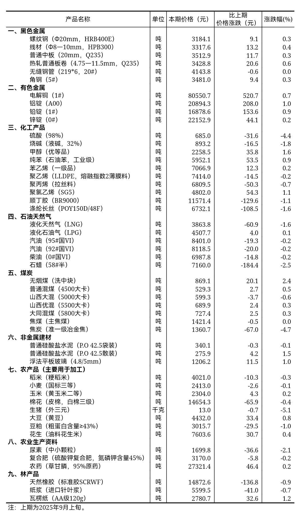 今天,国家统计局发布2025年9月中旬流通领域重要生产资料市场价格变动情况。