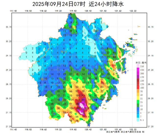 据中央气象台监测,“桦加沙”中心附近最大风力曾达17级以上,虽于24日在广东深圳至徐闻一带沿海登陆,但因其环流覆盖范围广、水汽充沛,浙江自23日起已受明显影响。浙江省气象台数据显示,此次影响的最强降雨时段为23日夜间至24日白天,温州、台州、宁波南部和丽水东部成为核心影响区域,部分地区出现暴雨,温州和台州南部局部达大暴雨量级。