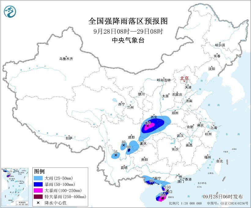 预计,9月28日8时至29日8时,四川东部和南部、陕西南部、河南西部、湖北西北部、重庆西部和北部、云南北部、广西南部、广东西南部、海南岛等地部分地区有大到暴雨,其中,陕西南部、四川盆地北部、海南岛中南部等地部分地区有大暴雨,海南岛东南部局地特大暴雨(250~280毫米)。上述部分地区伴有短时强降水(最大小时降雨量20~50毫米,局地可超过60毫米),局地有雷暴大风等强对流天气。