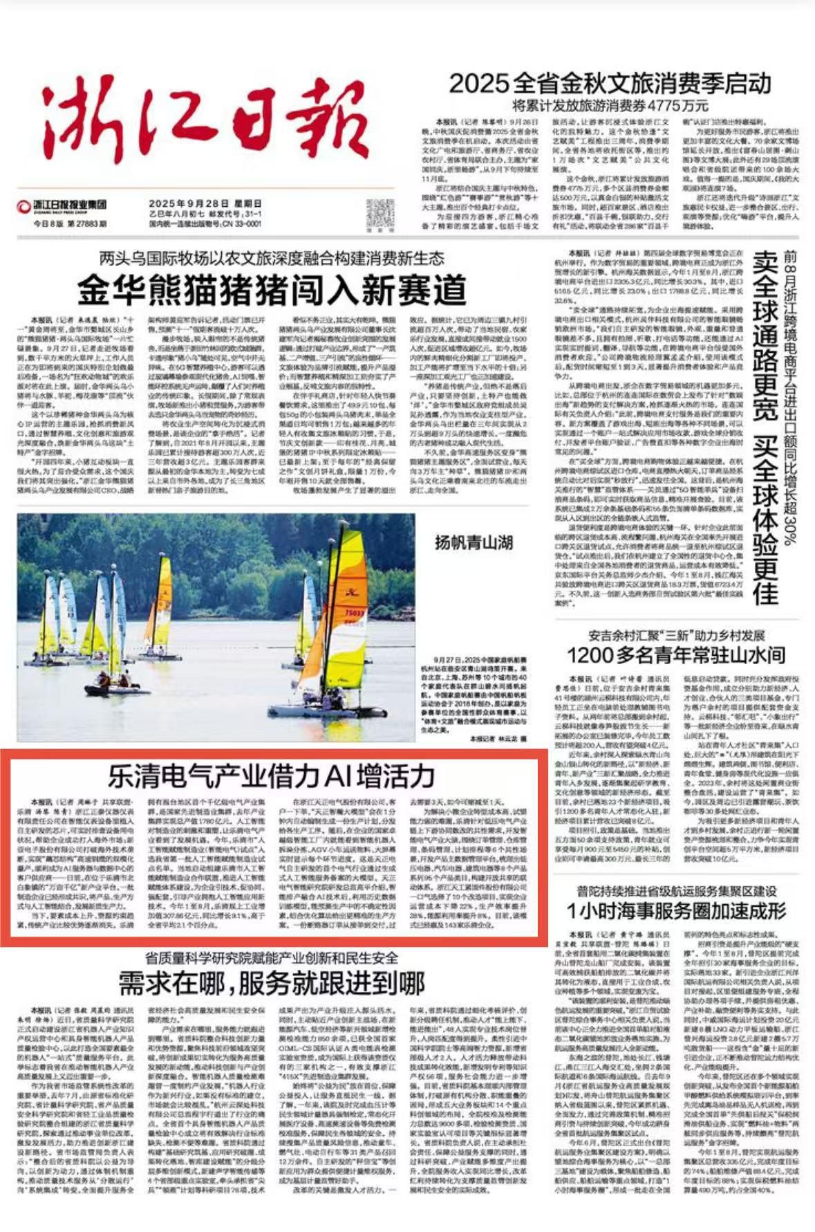 浙江正泰仪器仪表有限责任公司在智能仪表设备里植入自主研发的芯片,可实时排查设备用电状况,帮助企业成功打入海外市场;新亚电子股份有限公司打破海外技术垄断,实现“藕芯结构”高速铜缆的规模化量产,顺利成为AI服务器与数据中心的客户供应商……日前,在位于乐清市北白象镇的“万亩千亿”新产业平台,一批制造企业已经形成共识,将产品、生产方式与人工智能结合,发展新质生产力。